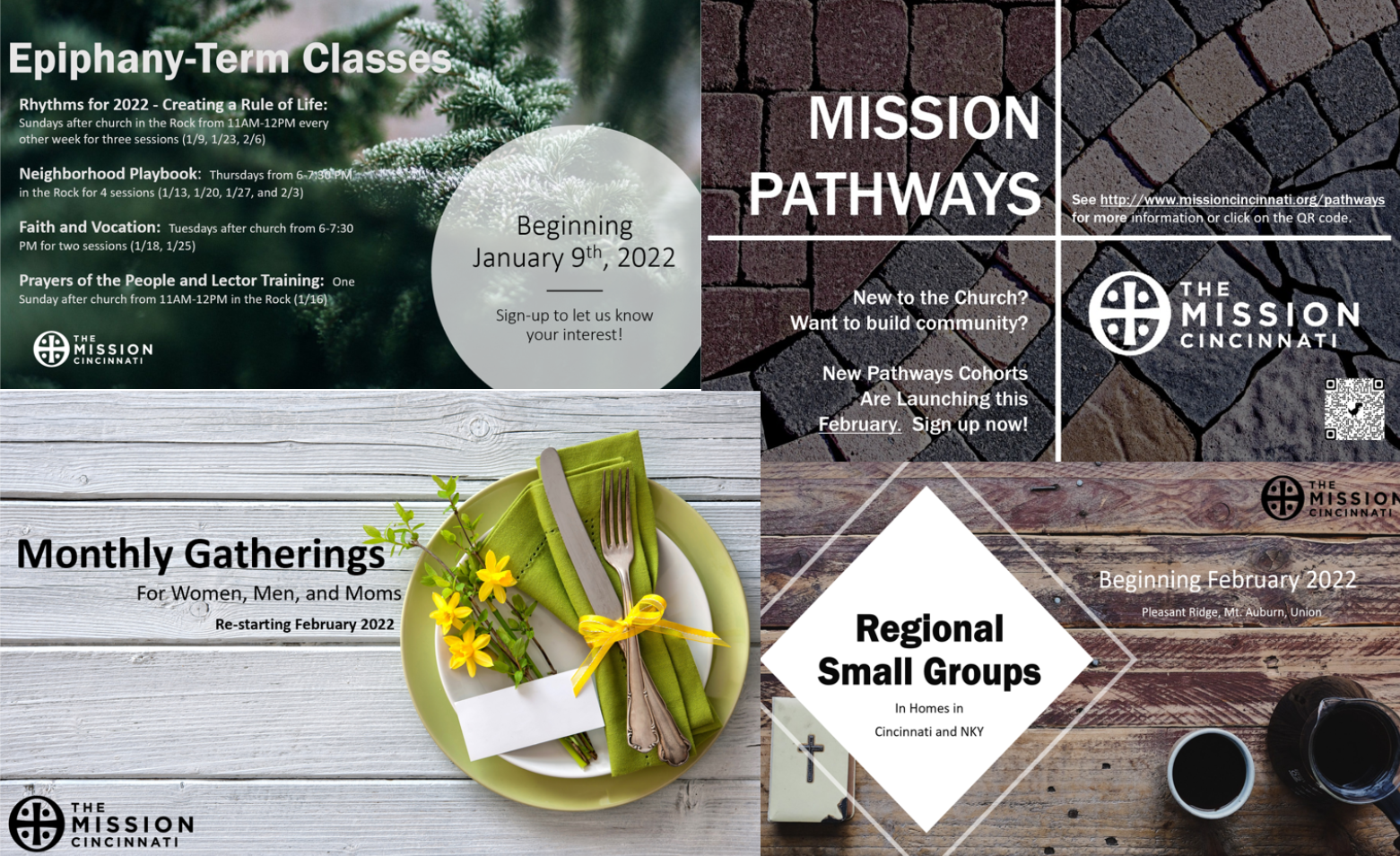 Starting in mid-February, we are going to launch our first ever Regional Small Groups! These intergenerational groups will be meeting all around Cincinnati and NKY and will provide an opportunity for fellowship/food, prayer, and engagement with the previous week’s sermon or another Scriptural topic of interest. These groups are open to everyone inside and outside the church and are great spaces to continue to deepen one’s relationship with the Lord and one another. If you have already gone through the Pathways cohorts, these are a great next step for you. Our Winter/Spring 2022 Regional Small Groups will be meeting through the middle of May in Pleasant Ridge, Mt. Auburn, and Union KY, and we expect to expand these offerings in the Fall of 2022.